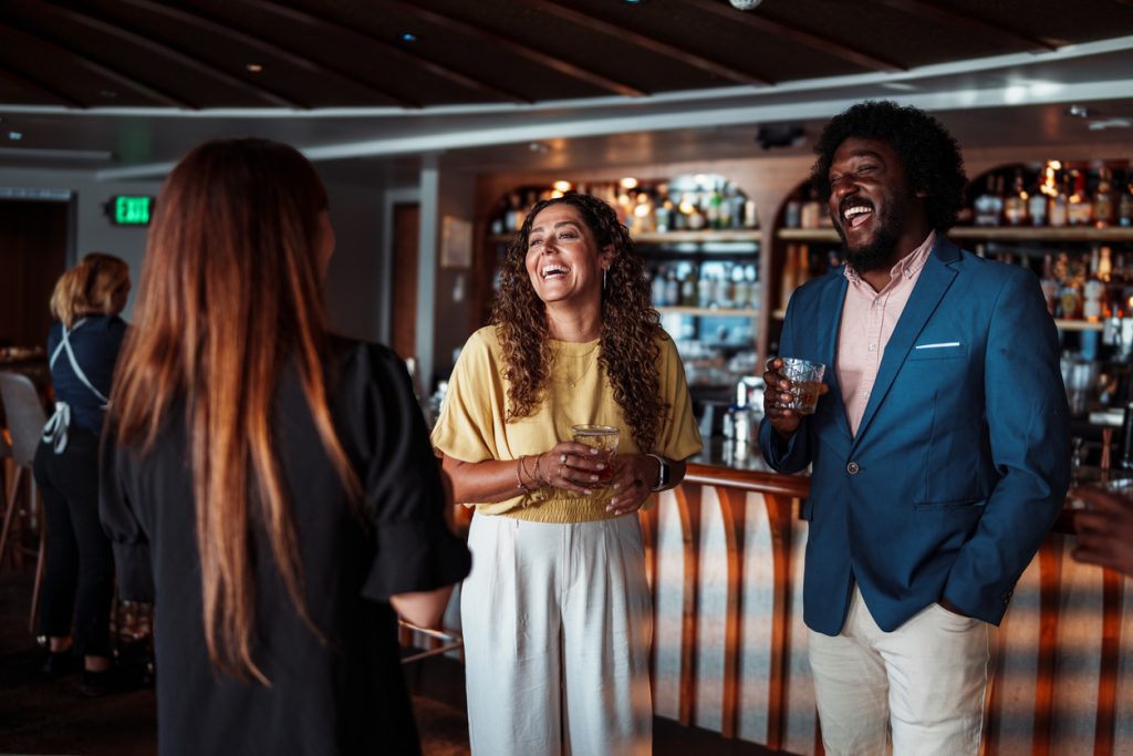 Well again, dude, the thing that will take all the pressure off of you is just asking some questions. “Where are you from? What do you love doing for fun? What are you guys up to tonight? Where are you all headed?” Just simple, basic questions like that makes it so easy. If she likes you, she’s going to be happy to talk to you. If she doesn’t like talking to you, again, this is all laid out in the book, if you look at her body language and it looks like she’s just trying to get away, looking for a pause in a conversation, and she doesn’t seem excited to talk to you, you can say, “Hey, well I’m going to get back to my friends. Hey, I’m going to go grab a drink. It’s been nice chatting with you. It’s been nice chatting with you girls. Y’all have a great night. Maybe we’ll bump into each other again.” Take your glass, cheers, and on your way to the next group of people.